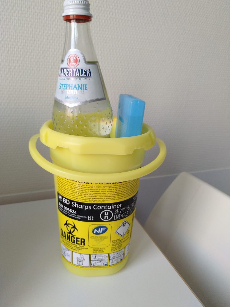Da ich aufgrund der Isolation nicht unbedingt das Zimmer verlassen soll, hab ich auch gleich noch etwas kaltes Wasser geordert. Eine Flasche sogar in einem etwas unkonventionellen aber zweckmäßigen Kühlbehälter. (siehe Foto)