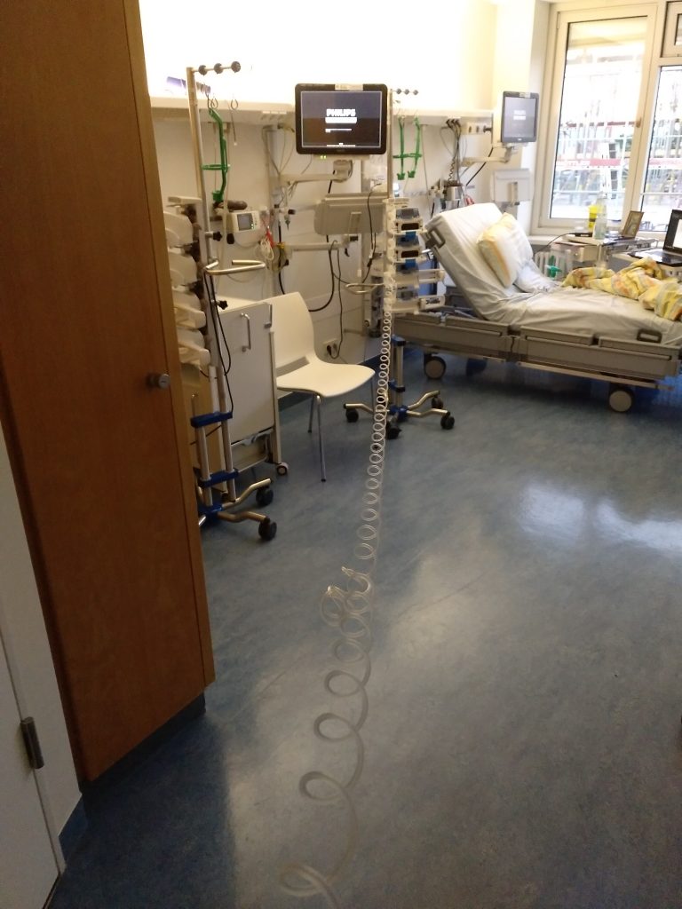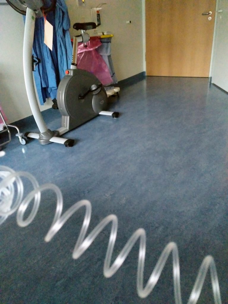 Nachdem ich das Zimmer eh nicht verlassen kann/darf und dieser Schlauch so lang und dehnbar ist, könnte ich wahrscheinlich einmal mit dem Ding an mir dran um den Raum laufen.